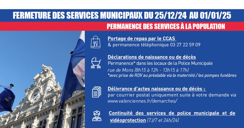 Fermeture de la mairie du mercredi 25 décembre 2024 au 1er janvier 2025 19 décembre 2024 Partager l'article sur Nous vous informons que la mairie sera fermée du mercredi 25 décembre au mercredi 1er janvier inclus, en raison des fêtes de fin d’année. Durant cette période, une permanence des services à la population sera disponible : Portage de repas par le CCAS et permanence téléphonique les 26, 27, 30 et 31 décembre 2024 au 03.27.22.59.09 Déclaration de naissance ou de décès permanence avec prise de rdv préalable dans les locaux de la police municipale Délivrance d’actes de naissance ou de décès par courrier postal uniquement suite à votre demande via : https://www.valenciennes.fr/demarches/etat-civil-cimetieres/naissances-et-deces/ Aucun rendez-vous pour une délivrance de pièce d’identité ou de passeport ne sera attribué durant cette période. Les usagers sont ainsi invités à prendre rendez-vous pour le retrait de leur pièce d’identité avant ou après cette période de fermeture. Nous vous remercions de votre compréhension et vous souhaitons de joyeuses fêtes de fin d’année. A découvrir également Toutes les actualités Instagram 15 Déc 2025 🎄✨️ Noël en Jésuites 📍Médiathèque Simone Veil Plus que 5 ... Accéder à la publication Facebook 15 Déc 2025 [✨Mon Noël à Valenciennes✨] 𝐑𝐞𝐭𝐨𝐮𝐫 𝐞𝐧 𝐢𝐦𝐚𝐠𝐞𝐬 𝐬𝐮𝐫 𝐯𝐨𝐭𝐫𝐞 𝐰𝐞𝐞𝐤-... Accéder à la publication Facebook 12 Déc 2025 🎄✨ 𝐌𝐨𝐧 𝐍𝐨𝐞̈𝐥 𝐚̀ 𝐕𝐚𝐥𝐞𝐧𝐜𝐢𝐞𝐧𝐧𝐞𝐬 ! ✨🎄 Demain commence votre week... Accéder à la publication