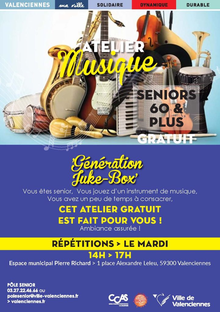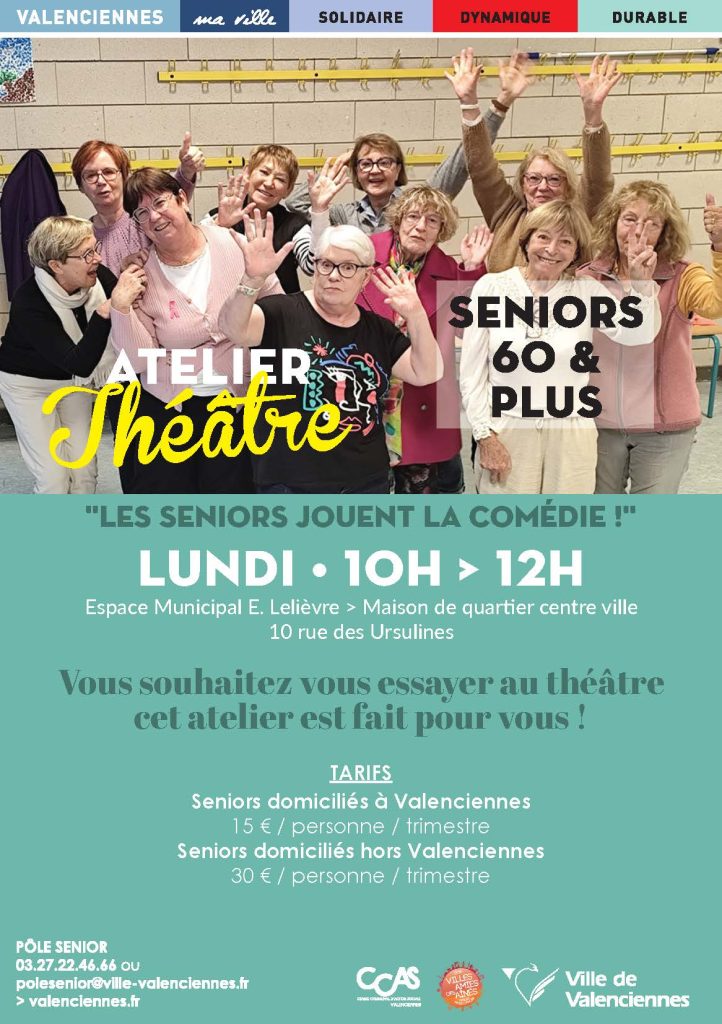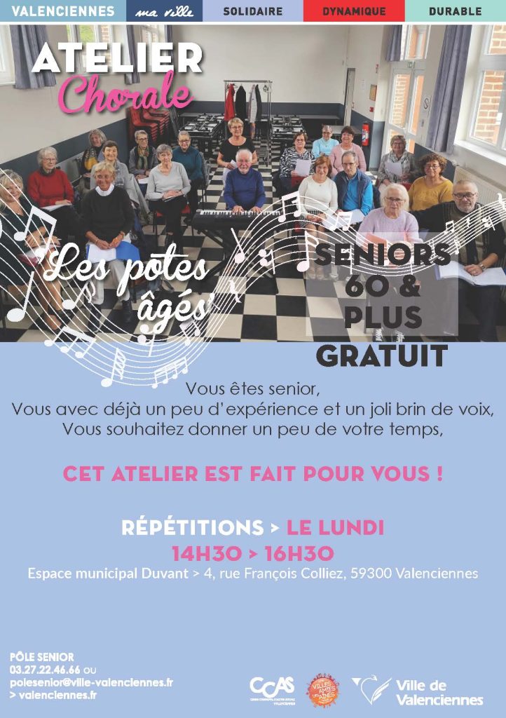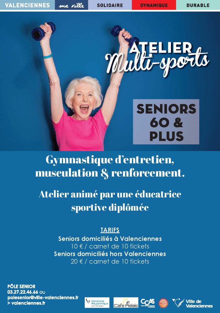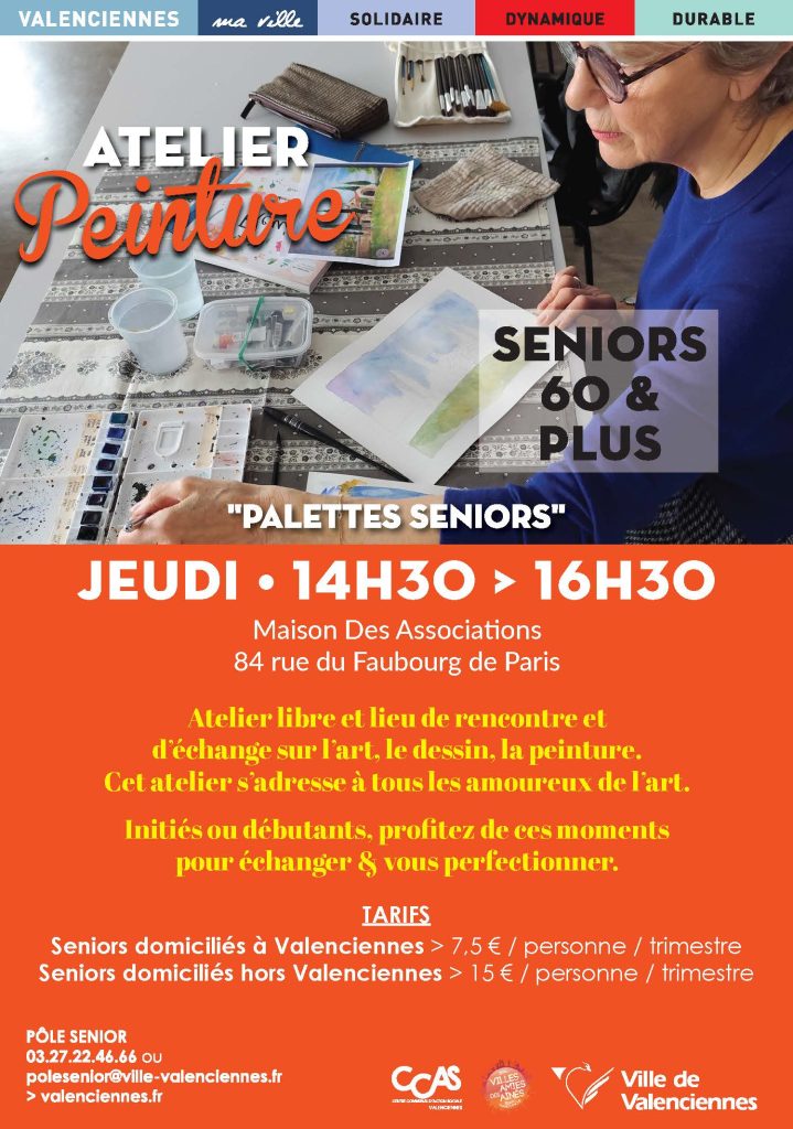 loisirs_seniors Les ateliers seniors La Ville organise des ateliers adaptés aux attentes de chacun, animés par des professionnels et/ou des bénévoles, favorisant des rencontres conviviales autour de diverses thématiques. Ces ateliers accueillent les seniors de 60 ans et plus, qu’ils résident à Valenciennes ou non. Inscriptions et renseignements auprès du Pôle Senior 03.27.22.46.66 – polesenior@ville-valenciennes.fr Pour toute inscription aux ateliers, merci de vous munir d’une pièce d’identité, d’un justificatif de domicile de moins de 3 mois et pour toute activité sportive, d’un certificat médical d’aptitude (valable 3 ans) Atelier multi-sports Ce cours de sport, animé par une éducatrice sportive diplômée, vous fera redécouvrir des exercices dynamiques adaptés à votre corps. Lundi : Low impact aérobic (gym dansée) – chaque 1er lundi du mois de 14h à 15h Mardi : gymnastique d’entretien et renforcement musculaire de 14h à 15h et de 15h15 à 16h15- Salle municipal St Waast – Domaine de la Plaine Mercredi : Musculation sur appareils de 14h à 15h et de 15h15 à 16h15 – Salle des tertiales – 204 boulevard des Alliés. Jeudi : gymnastique d’entretien de 9h30 à 10h30 et de 10h45 à 11h45 à l’Espace Municipal Pierre Richard, 1 place Alexandre Leleu gymnastique d’entretien de 14h à 15h et de 15h15 à 16h15 à l’Espace Municipal Ernest Lelièvre, maison de quartier centre ville, 10 rue des Ursulines Tarifs seniors domiciliés à Valenciennes 1 carnet de 10 tickets = 10€ (1 ticket par cours) seniors domiciliés hors Valenciennes 1 carnet de 10 tickets = 20€ (1 ticket par cours) Inscrivez-vous au PÔLE SENIORS 03.27.22.46.66 ou polesenior@ville-valenciennes.fr. Pour cet atelier, un certificat médical est obligatoire (valable 3 ans) Ce planning pourra être soumis à des modifications d’horaires, de salles et d’intervenant afin de veiller au meilleur fonctionnement possible de l’atelier.Selon votre âge et votre condition physique, vous pouvez également pratiquer dans un des nombreux clubs de sport de la ville, une activité conseillée aux seniors : marche, yoga, natation, aquagym, pétanque, gymnastique d’entretien. Atelier théâtre « Les seniors jouent la comédie » Cultiver l’humour et le rapport aux autres : atelier d’expression orale et corporelle sur la concentration, l’imagination, la fantaisie, la relaxation, la mémoire sensorielle et affective, l’improvisation. Lundi de 10h à 12h – Espace municipal Ernest Lelièvre (Maison de quartier) Tarifs Seniors domiciliés à Valenciennes : 15€ / personne / trimestre Seniors domiciliés hors Valenciennes : 30€ / personne / trimestre Atelier peinture Atelier libre et lieu de rencontre et d’échange sur l’art, le dessin, la peinture. Cet atelier s’adresse à tous les amoureux de l’art. Initiés ou débutants, profitez de ces moments pour échanger et vous perfectionner. Jeudi de 14h30 à 16h30 à la Maison Des Associations 84 rue du Faubourg de Paris Tarifs Seniors domiciliés à Valenciennes : 7,50€ / personne / trimestre Seniors domiciliés hors Valenciennes : 15€ / personne / trimestre Atelier musique Vous êtes senior, vous jouez d’un instrument de musique, vous avez un peu de temps à consacrer, Cet atelier gratuit est fait pour vous ! Génération Juke-Box vous attend pour se produire lors d’animations et dans les structures d’accueil pour personnes âgées de la ville. répétitions le mardi de 14h à17h Espace municipal Pierre Richard – Grande salle 1 place Alexandre Leleu Atelier chorale Vous êtes senior, vous avec déjà un peu d’expérience et un joli brin de voix, vous souhaitez donner un peu de votre temps, Cet atelier gratuit est fait pour vous ! Les Potes Agés vous attendent pour se produire lors d’animations et dans les structures d’accueil pour personnes âgées de la ville. répétitions le lundi 14h30 à 16h30 – Espace Municipal Duvant 4 rue François Colliez, 59300 valenciennes Thés dansants Rejoignez-nous pour deux après-midis inoubliables de thés dansants spécialement dédiés aux seniors.Ces événements sont gratuits sur inscription et offrent une merveilleuse opportunité de se divertir, de socialiser et de profiter de la musique entraînante dans une ambiance chaleureuse et conviviale. Ne manquez pas ces rendez-vous festifs ! Vous souhaitez participer au thé dansant du 13 avril 2025 : Inscrivez-vous entre le 17 mars et le 4 avril 2025 Vous souhaitez participer au thé dansant du 26 octobre 2025 : Inscrivez-vous entre le 29 septembre et le 17 octobre 2025 Gratuit sur inscription au 03.27.22.46.66Salle des TertialesNombre de places limitées Café relais, un espace intergénérationnel de rencontre et de convivialité C’est dans une ambiance chaleureuse et accueillante que nous vous accueillons au Café RELAIS. Situé dans les locaux de l’Université des Tertiales, cet espace de rencontre vous propose : un espace détente autour d’une boisson, un espace d’information et de documentation de loisirs, un accès libre à sa bibliothèque, un espace numérique pour être accompagné dans vos démarches et vous orienter si nécessaire, Situé en centre-ville, le Café RELAIS est un espace de rencontre intergénérationnelle et de multi-activités. Vous serez accueillis par notre animatrice et pourrez participer à de nombreuses animations gratuites : « Ma bulle de bien-être », ateliers culturels, conférences, prévention, jeux de société, lotos … MARDIS et VENDREDIS de 12h à 17h JEUDIS de 13h30 à 17h(hors vacances scolaires universitaires) Renseignements au Pôle Senior : 03.27.22.46.66 ou 06.13.81.83.27 ou 06.30.52.90.39 – polesenior@ville-valenciennes.frRetrouvez les différentes dates des plannings » Les rendez-vous du café relais » dans notre agenda
